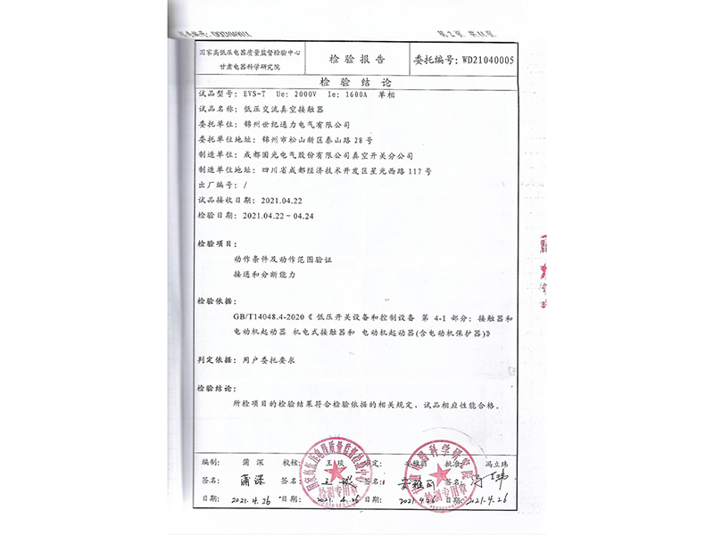 報告礦熱爐低壓無功補償專用真空接觸器型式試驗報告